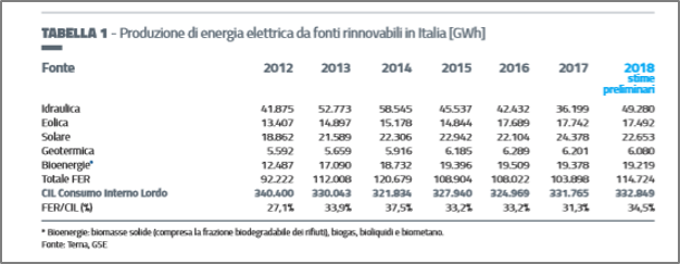 Applicando le definizioni e i criteri di calcolo previsti dalla Direttiva 2009/28/CE ai fini del monitoraggio degli obiettivi UE sulle FER, normalizzazione delle produzioni idroelettrica ed eolica, contabilizzazione dei soli bioliquidi e biocarburanti sostenibili, nel 2017 i Consumi Finali Lordi (CFL) di energia da FER in Italia risultano pari a 22 Mtep, in aumento di circa 920 ktep rispetto al 2016, +4,4%. La quota dei CFL coperta da FER nel 2017 risulta pertanto pari a 18,3%, in crescita rispetto al dato rilevato l’anno precedente, 17,4%, superiore al target assegnato all’Italia dalla Direttiva 2009/28/CE per il 2020. Il trend positivo si è verificato per il quarto anno consecutivo. Nel 2017 c'è il record storico nella produzione fotovoltaica per 24,4 TWh, +10,3% rispetto al 2016, mentre il consumo diretto di biomassa nel settore residenziale, di 6,8 Mtep, registra un + 9,5% rispetto al 2016.