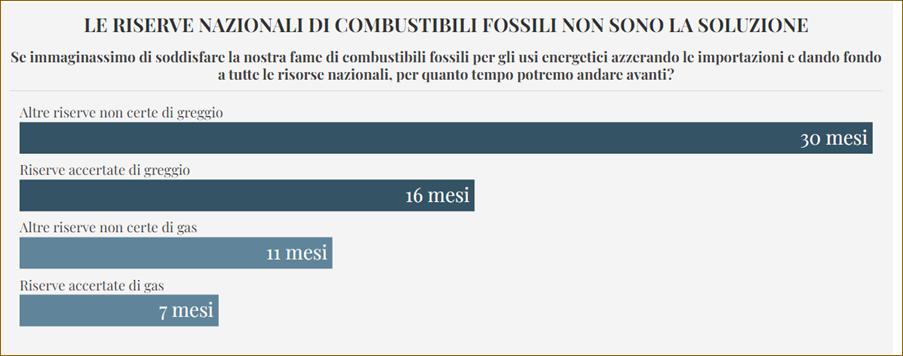Il ministero dello Sviluppo economico ha aggiornato l'ultima stima delle riserve italiane di combustibili fossili il 31 dicembre 2019. Secondo queste stime in Italia le riserve accertate di gas sono pari a 46 miliardi di metri cubi e quelle di petrolio a 73 milioni di tonnellate. Se includiamo anche le riserve classificate come probabili e possibili saliamo rispettivamente a 112 miliardi di metri cubi e 207 milioni di tonnellate. Se immaginassimo di soddisfare la nostra fame di combustibili fossili per gli usi energetici azzerando le importazioni e dando fondo a tutte le risorse nazionali, per quanto tempo potremo andare avanti? Negli ultimi trent'anni si è ridotta di meno di 10 punti percentuali. Praticamente tutta la riduzione della dipendenza energetica italiana si è verificata fra il 2008 e il 2014, proprio il periodo di massima crescita delle fonti rinnovabili con il raddoppio della produzione nazionale di elettricità verde.