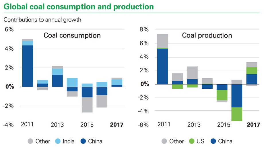 Giugno 2018. BP pubblica la 67° edizione del suo Rapporto "Statistical review of world energy" che racconta la storia del carbone negli ultimi anni (> scarica il Rapporto) è ora disponibile il bilancio annuale della BP sull'energia mondiale, un compendio di fatti, cifre, grafici sull'uso globale dell'energia. L'edizione di quest'anno contiene uno dei più allarmanti grafici che si siano visti da molto tempo. è il grafico che mostra una netta inversione di tendenza dell'uso del carbone dopo diversi anni di declino.