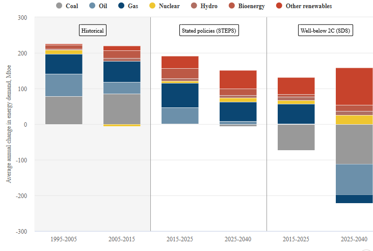 La domanda di petrolio inizierà a stabilizzarsi solo al 2030 (linea arancione) a causa dell'aumento dell'efficienza dei veicoli e dell'aumento dei veicoli elettrici (EV), con il picco della domanda di carburante per il trasporto atteso alla fine degli anni '20. La domanda di petrolio per merci, spedizioni, aviazione e prodotti chimici continua a crescere con la crescente diffusione dei SUV, un altro fattore potenziale che sostiene la domanda. Nel quadro STEPS circa i due terzi dell'aumento della domanda globale di energia al 2040 arriva dalla regione dell'Asia - Pacifico. L'India diventa il Paese più popoloso del mondo e la sua domanda di energia raddoppia, con il maggiore contributo alla crescita globale e alla contabilità energetica, oltre un quarto dell'aumento totale. All'interno di questo totale, STEPS vede crescere la domanda di carbone dei paesi asiatici che compensa i grandi cali negli Stati Uniti e in Europa. nonostante che i nuovi investimenti e le decisioni sulle infrastrutture che utilizzano il carbone abbiano subito un brusco rallentamento. L'aumento delle energie rinnovabili previsto da STEPS fino al 2040 non dissimula la natura lenta della transizione del sistema energetico globale. Anche se STEPS traccia un futuro in cui le energie rinnovabili coprono metà dell'aumento della domanda al 2040 e il ritmo della crescita della domanda rallenta a causa del mutamento economico e della efficienza energetica, si rimane ben al di sotto di quanto sarebbe necessario per mettere un limite alle emissioni globali di CO2. Se gli aumenti delle temperature globali devono essere fermati, saranno necessarie modifiche drastiche, come mostrato nello scenario sostenibile SDS in figura.
