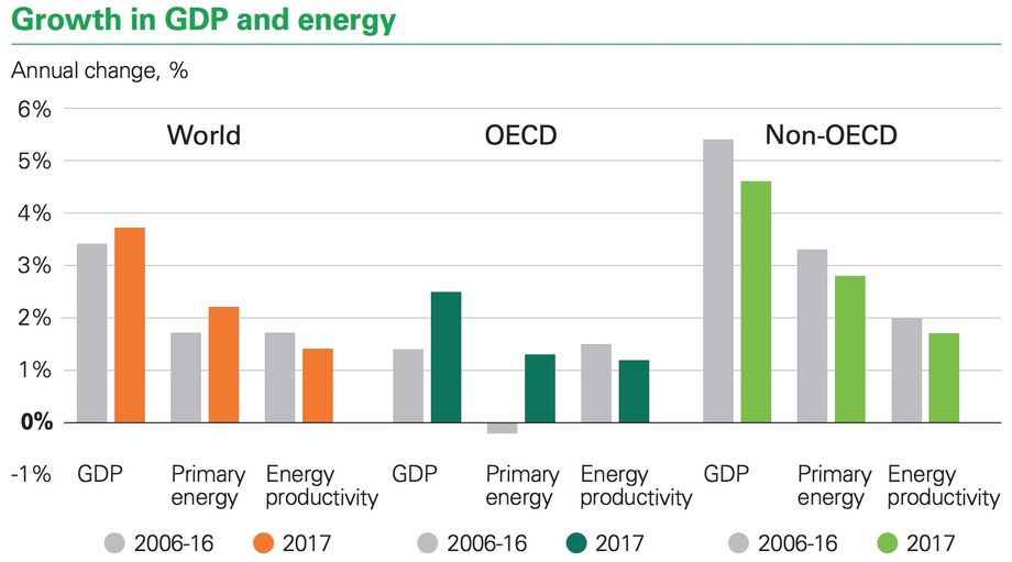 Il quadro pessimistico del 2017 è completato dai dati macroeconomici che vedono diminuire la produttività energetica e i dati del consumo di energia primaria in crescita nei paesi OECD che aiutano a spiegare perché le emissioni globali di biossido di carbonio, dopo aver mantenuto una stabilità approssimativa per tre anni, hanno iniziato a risalire nel 2017. Secondo la BP si vanno perdendo alcune delle tendenze cicliche a breve termine che stavano aiutando a determinare i risultati positivi degli ultimi anni: il rallentamento della domanda di energia, l'aumento della produttività energetica e la stabilizzazione delle emissioni di anidride carbonica. L'industria pesante riprende di nuovo in Cina appoggiandosi sul carbone, dopo anni di declino, e sta crescendo rapidamente in India. Soprattutto, la crescita economica è accelerata. Le fonti rinnovabili hanno continuato a crescere, ma finché la maggior parte dell'economia mondiale è alimentata dai combustibili fossili, una tendenza macro come la crescita economica sta per sopraffare l'aumento di energia rinnovabile.