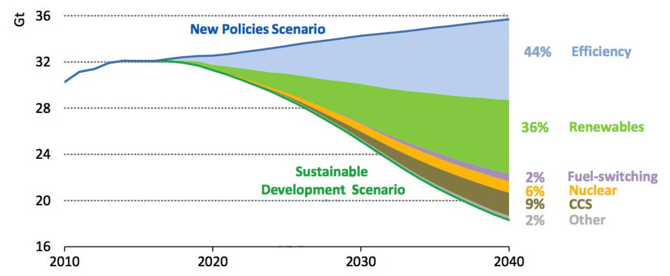 Le nuove politiche. Lo scenario delle politiche nuove parte dalle "politiche correnti" e aggiunge gli impegni dell'Accordo di Parigi, così come altre politiche nazionali e regionali che sono state annunciate, ma non ancora implementate. In questo scenario, il consumo globale di carbone raggiunge i picchi intorno al 2020 e rimane pressoché invariato fino al 2040. Le centrali elettriche attualmente in costruzione vengono completate e pochi sono gli impianti che vengono chiusi, ma quasi tutta la nuova domanda di energia a livello mondiale è soddisfatta dagli altri combustibili. Il consumo globale di energia è circa l'8% in meno rispetto alle "politiche correnti" e le energie rinnovabili svolgono un ruolo molto più importante nella produzione di elettricità. Lo scenario delle nuove politiche è l'interesse principale del WEO 2017 ed anche quello cui è dedicato il maggior numero di elaborazioni. Le proiezioni sulle emissioni per il 2040 sono coerenti con lo scenario IPCC con un riscaldamento di circa 2,5 °C (2-3 °C) nel 2100, denominato IPCC RCP4.5. Sviluppo sostenibile. Il nuovo scenario di sviluppo sostenibile nella relazione WEO 2017 è un'evoluzione del loro precedente "scenario 450 ppm" che mirava a limitare le concentrazioni di CO2 nell'atmosfera a non più di 450 parti per milione. In più, in coerenza con lo SDG7 dell'agenda 2030, offre la garanzia universale di accesso all'energia e la riduzione dell'inquinamento atmosferico. Nello "sviluppo sostenibile", il consumo mondiale di carbone diminuisce di oltre il 50% entro il 2040. L'uso di gas naturale rimane costante, il petrolio si riduce in modo modesto e la domanda complessiva di energia è inferiore del 20% rispetto alle "politiche correnti". Le differenze della domanda di energia spiegano circa la metà della differenza tra "nuove politiche "e" sviluppo sostenibile ", con le energie rinnovabili, eolica e solare in particolare, che riempiono gran parte del vuoto rimanente lasciato dal calo dell'uso del carbone. La differenza tra gli scenari "nuove politiche" e "sviluppo sostenibile" è illustrata nella figura sotto che ne evidenzia le componenti.