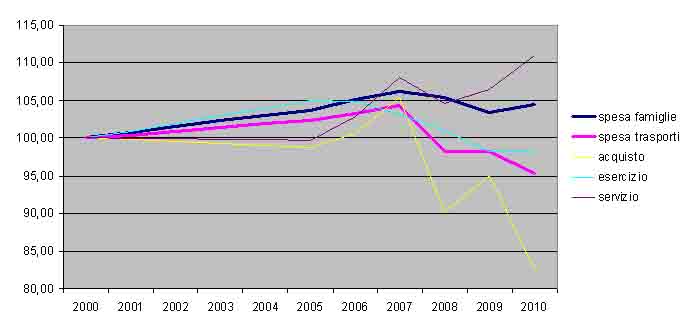 L'ammontare complessivo delle spese per le autovetture in Italia è stato stimato nel 2009 in circa 142 mld di euro. Di questa cifra 95 mld riguardano le spese di esercizio, 38,2 riguardano l’acquisto delle autovetture nuove e 8,7 mld riguardano la manutenzione straordinaria. Nel 1990 mediamente le famiglie italiane spendevano circa il 12,6 % dei propri consumi totali per i trasporti, un valore molto simile a quello rilevato nel 2010 (12,9%) dopo che nel 2000 aveva raggiunto il 14,1%. Ciò che è variato è la composizione di questi consumi che tendono negli ultimi 10 anni a penalizzare l’acquisto di mezzi di trasporto ed invece a far prevalere quelli per mantenerli in esercizio, crescendo percentualmente anche la quota dei consumi riservati all'acquisto di servizi di trasporto. La spesa pubblica nel settore dei trasporti nell'anno 2009 è stata complessivamente di 24 mld di euro su un totale della spesa pubblica di 507 mld. La spesa corrente ha assorbito il 47, 7% mentre quella in conto capitale il 52,3%. La spesa risulta destinata per il 30,8 % alla strada, il 26,9 % agli impianti fissi (ferrovie, metropolitane, etc.), il 14,3 alla navigazione marittima, il 2,6% alla navigazione aerea lo 0,5 % alla navigazione interna. è molto utile, al fine di una valutazione economica generale, comparare l'impatto dei sussidi statali, diretti o indiretti, alle esternalità prodotte dai mezzi di trasporto. Uno studio dell'EEA mostra che purtroppo, anche su base europea e non solo in Italia, esiste un forte squilibrio determinato dal fatto che i sussidi statali più alti sono comunque destinati alla modalità di trasporto a maggior costo sociale e ambientale (la strada). Costi sociali dei trasporti Fonte EEA 2007