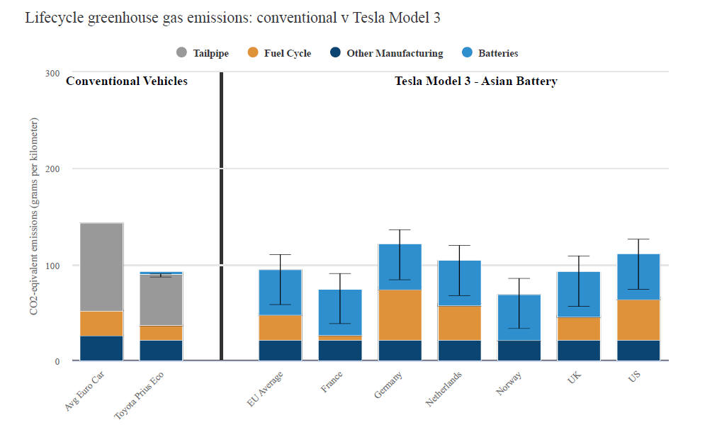 Nella maggior parte dei paesi, la maggior parte delle emissioni nel ciclo di vita di entrambe le auto, elettrica e a combustione interna, provengono dal funzionamento del veicolo, dal tubo di scappamento e dal ciclo del combustibile, piuttosto che dalla fabbricazione del veicolo. L'eccezione è nei paesi, Norvegia o Francia, dove quasi tutta l'elettricità è prodotta quasi senza carbonio da fonti, come l'energia idroelettrica o nucleare (cfr. NREL, Life Cycle Assessment Harmonization). Tuttavia, mentre il carbonio emesso dalla combustione di un gallone di benzina o diesel è stechiometrico e non può essere ridotto, lo stesso non vale per la generazione elettrica. Il grafico presentato qui sopra basa le emissioni dei veicoli elettrici sull'attuale mix di rete in ciascuna nazione. Tuttavia, se gli obiettivi climatici fissati nell'accordo di Parigi devono essere soddisfatti, la generazione elettrica diventerà significativamente meno di carboni intensiv, aumentando ulteriormente il vantaggio dei veicoli elettrici rispetto a quelli convenzionali. Ad esempio, nel Regno Unito, le emissioni dalla generazione di elettricità sono diminuite del 38% negli ultimi tre anni e ci si aspetta che cadano di oltre il 70% entro la metà o la fine del 2020, che è ben all'interno della durata di vita dei veicoli elettrici acquistati oggi. La stima centrale delle emissioni prodotte dalla batteria nell'analisi ICCT è identica allo studio IFO. La Nissan Leaf qui analizzata ha una energia stoccata di 30 kWh nella batteria, mentre il Tesla Model 3 ha o 50kWh o 75kWh. La figura seguente mostra le emissioni del ciclo di vita stimato di un modello Tesla 3 se la batterie sono stati prodotte in Asia, che ha una grande parte della sua elettricità generata dal carbone, come nel caso delle batterie Nissan Leaf. Viene utilizzato il modello a l 75kWh, per coerenza con l'approccio nello studio IFO. Le emissioni di produzione del modello di batteria di fascia media di 50kWh sarebbero di circa un terzo inferiori.