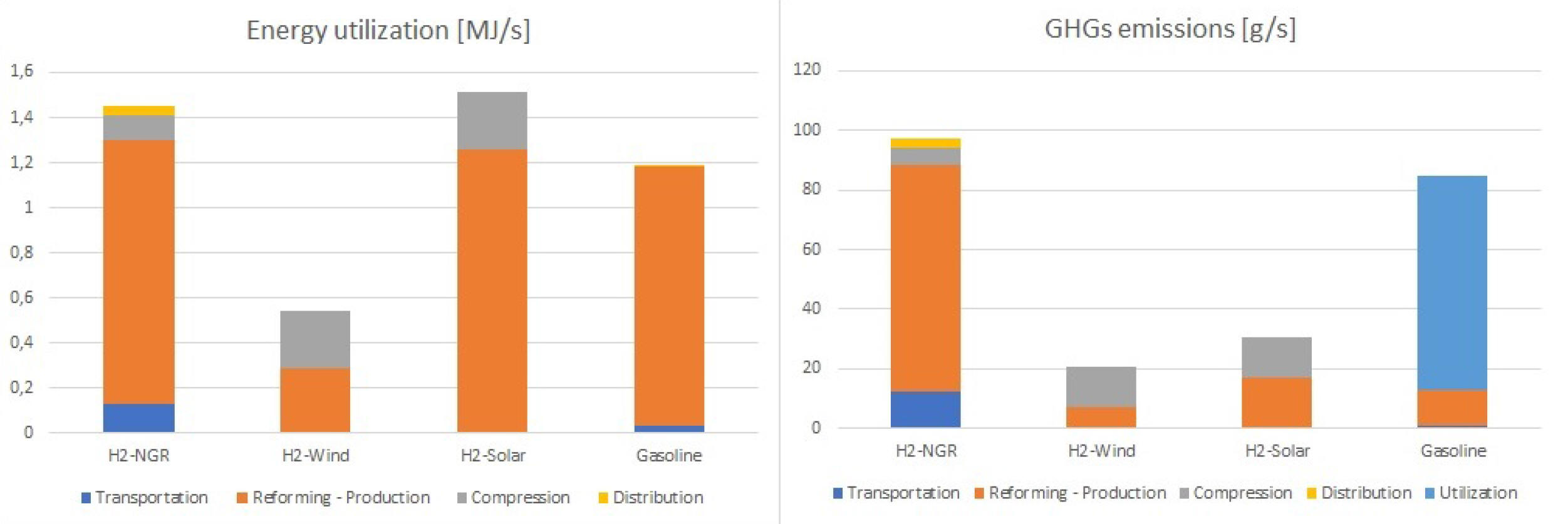 La produzione di idrogeno da energie rinnovabili si distingue per l'assenza di uso diretto di combustibili fossili. L'idrogeno generato dall'energia eolica ha il consumo energetico più basso, mentre l'idrogeno prodotto da energia solare ha il consumo maggiore principalmente a causa dell'energia fossile necessaria per i materiali e le attrezzature dell'impianto. La produzione di idrogeno da steam reforming. NGR, sembra essere meno efficiente della produzione di benzina mediante distillazione del petrolio greggio. L'energia del carburante di benzina e idrogeno sono entrambe convertite in lavoro meccanico con efficienze diverse tra un ICE, un motore a combustione interna, e un PEMFC, un proton exchange membrane fuel cell, rispettivamente 20-30% e 40-60%. Le emissioni GHG sono anche illustrate nella medesima figura. Risulta che le emissioni della benzina sono quasi uguali alle emissioni dovute all'idrogeno prodotto tramite steam reforming, ma nel complesso i risultati dimostrano che i veicoli a celle a combustibile a idrogeno possono essere una valida soluzione per ridurre le emissioni correlate al trasporto. La produzione di idrogeno attraverso le energie rinnovabili riduce drasticamente le emissioni di gas serra. Il principale problema con la produzione rinnovabile di idrogeno rimane la questione economica. Il costo della produzione di idrogeno da gas naturale è il più basso tra tutte le opzioni considerate, ed infatti lo steam reforming del gas naturale è il metodo più comunemente usato per la produzione di idrogeno in tutto il mondo e può soddisfare grandi volumi di domanda.