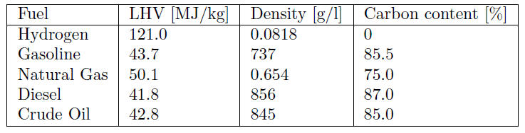 veicoli a idroge La tabella a destra dà le caratteristiche fisico-chimiche dei combustibili a pressione ambiente e 278 °K. La produzione di inquinanti da parte del gas naturale in combustione è nella tabella a sinistra in peso per grammo.