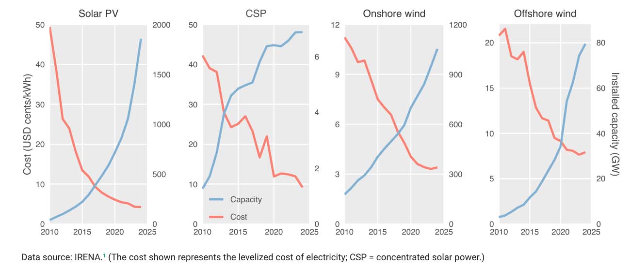 Il crollo dei costi ha fatto sì che il solare e l'eolico diventassero le fonti di elettricità in più rapida crescita nella storia, e la crescita delle energie rinnovabili sta ora superando quella dei combustibili fossili nel settore energetico. Nel 2024, le rinnovabili hanno costituito il 92,5% di tutte le nuove aggiunte di capacità elettrica e il 74% della crescita della generazione di elettricità. Tra il 2015 e il 2024, la capacità elettrica annuale globale delle rinnovabili è aumentata di circa 2.600 GW, mentre quella dei combustibili fossili è aumentata di circa 640 GW. Di conseguenza, le quote di combustibili fossili e rinnovabili nella capacità elettrica installata a livello globale sono ora quasi 1:1. In termini di generazione annuale di elettricità a livello globale, le rinnovabili sono aumentate di 4.470 TWh (81%), mentre i combustibili fossili sono aumentati di 2.150 TWh (13%). Nel frattempo, le vendite di veicoli elettrici sono aumentate del 3.300%, passando da 0,5 milioni nel 2015 a oltre 17 milioni nel 2024. Gli esperti ritengono che il solare, l'eolico e i veicoli elettrici abbiano irreversibilmente superato un punto di svolta positivo e siano entrati in un circolo virtuoso di calo dei costi e adozione diffusa. Di conseguenza, sta emergendo una nuova economia dell'energia pulita, che contribuisce alla crescita del prodotto interno lordo (PIL) e crea posti di lavoro, aiutando al contempo a disaccoppiare la crescita dalle emissioni. Gli investimenti annuali globali in energia pulita hanno superato i 2 trilioni di dollari per la prima volta nel 2024, avendo superato quelli per i combustibili fossili per la prima volta nel 2016. I posti di lavoro nel settore dell'energia pulita hanno raggiunto un totale di 34,8 milioni nel 2023, di cui 16,2 milioni nelle rinnovabili. Nel 2023, il settore ha aggiunto circa 320 miliardi di dollari all'economia globale, rappresentando il 10% della crescita del PIL a livello globale e quasi un terzo nell'Unione Europea (UE). Nel 2024, il settore dell'energia pulita ha rappresentato il 10% dell'economia della Repubblica Popolare Cinese e ha guidato un quarto della crescita del PIL del paese23. Dal 1990, la crescita economica si è disaccoppiata dalle emissioni di gas serra (GHG) per almeno cinque anni in più di 40 paesi. Accelerare la transizione dai combustibili fossili alle energie rinnovabili porta con sé una miriade di benefici sociali ed economici positivi. In particolare, le energie rinnovabili possono promuovere l'accesso, l'accessibilità economica e la sicurezza energetica. Circa il 74% della popolazione mondiale vive in paesi che sono importatori netti di combustibili fossili. La dipendenza dalle importazioni di combustibili fossili espone i paesi a prezzi volatili, interruzioni delle forniture e turbolenze geopolitiche. A seguito dello scoppio della guerra in Ucraina all'inizio del 2022, il prezzo del gas naturale - e di conseguenza i prezzi dell'elettricità in alcuni mercati - ha raggiunto livelli record, mentre i prezzi del petrolio hanno toccato il loro livello più alto dal 2008. Ciò ha aumentato direttamente i costi di riscaldamento, raffreddamento, illuminazione e mobilità, e ha indirettamente spinto verso l'alto i costi di altri beni e servizi lungo le catene di approvvigionamento globali, esacerbando la crisi del costo della vita nel 2022. In media, i consumatori di tutto il mondo hanno speso il 20% in più per le bollette energetiche rispetto alla media dei cinque anni precedenti; l'aumento è stato molto maggiore per i consumatori che vivono in paesi con un'elevata dipendenza dall'importazione di gas. I sistemi basati sulle energie rinnovabili, sia centralizzati che decentralizzati, offrono anche le soluzioni più economiche e veloci per garantire l'accesso universale all'energia pulita entro il 2030. La combinazione di soluzioni rinnovabili connesse alla rete, a mini-reti e fuori rete può essere sfruttata per fornire un accesso rapido e duraturo, specialmente in luoghi rurali difficili da raggiungere dove vivono otto persone su dieci senza accesso all'elettricità. Soluzioni solari autonome e fuori rete hanno servito in totale 490 milioni di persone entro il 2022. Numerosi studi dimostrano che l'adozione sistematica delle energie rinnovabili e i miglioramenti nell'efficienza energetica, combinati con politiche progressive, possono continuare a portare a guadagni netti in termini di posti di lavoro, PIL e altri benefici sociali man mano che la transizione progredisce nel breve, medio e lungo termine. L'implementazione di micro-reti di energia rinnovabile su piccola scala nei paesi in via di sviluppo ha dimostrato di contribuire in modo significativo allo sviluppo sostenibile migliorando i mezzi di sussistenza, riducendo la povertà e l'esposizione all'inquinamento e migliorando la sicurezza alimentare, la salute e l'istruzione37. Nonostante ciò, le energie rinnovabili non stanno sostituendo i combustibili fossili nei sistemi energetici al ritmo e alla scala necessari. Per consentire a tutti i paesi di cogliere i benefici dell'economia emergente dell'energia pulita, sarà necessario superare barriere strutturali e sfide importanti. Queste includono: lo sviluppo di quadri politici e normativi che forniscano condizioni di parità per l'energia pulita; la priorità alla modernizzazione e all'espansione di infrastrutture energetiche abilitanti critiche come reti e stoccaggio; il miglioramento della resilienza e della diversità delle catene di approvvigionamento di energia pulita; l'aumento della disponibilità, accessibilità e convenienza dei finanziamenti per la transizione energetica per le economie in via di sviluppo; e l'affronto della resistenza politica da parte degli interessi consolidati dei combustibili fossili. La diffusione e gli investimenti nelle tecnologie per le energie rinnovabili sono stati finora altamente concentrati nelle economie avanzate e in Cina.
