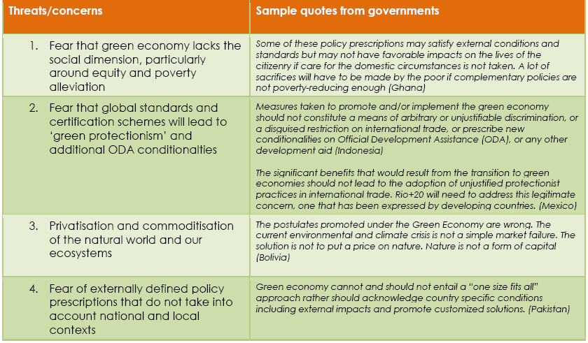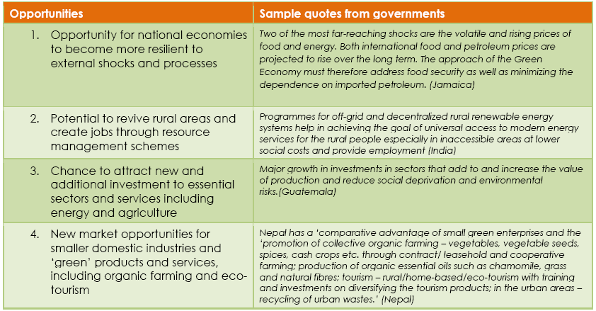 25. We are convinced that a green economy in the context of sustainable development and poverty eradication should contribute to meeting key goals – in particular the priorities of poverty eradication, food security, sound water management, universal access to modern energy services, sustainable cities, management of oceans and improving resilience and disaster preparedness, as well as public health, human resource development and sustained, inclusive and equitable growth that generates employment, including for youth. It should be based on the Rio principles, in particular the principle of common but differentiated responsibilities, and should be people-centred and inclusive, providing opportunities and benefits for all citizens and all countries. 26. We view the green economy as a means to achieve sustainable development, which must remain our overarching goal. We acknowledge that a green economy in the context of sustainable development and poverty eradication should protect and enhance the natural resource base, increase resource efficiency, promote sustainable consumption and production patterns, and move the world toward low-carbon development. 27. We underscore that green economy is not intended as a rigid set of rules but rather as a decision-making framework to foster integrated consideration of the three pillars of sustainable development in all relevant domains of public and private decision-making. 28. We recognize that each country, respecting specific realities of economic, social and environmental development as well as particular conditions and priorities, will make the appropriate choices. 29. We are convinced that green economy policies and measures can offer win-win opportunities to improve the integration of economic development with environmental sustainability to all countries, regardless of the structure of their economy and their level of development. 30. We acknowledge, however, that developing countries are facing great challenges in eradicating poverty and sustaining growth, and a transition to a green economy will require structural adjustments which may involve additional costs to their economies. In this regard, the support of the international community is necessary. 31. We note that the transformation to a green economy should be an opportunity to all countries and a threat to none. We therefore resolve that international efforts to help countries build a green economy in the context of sustainable development and poverty eradication must not: