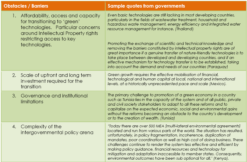 32. We acknowledge that countries are still in the early stages of building green economies and can learn from one another. We note the positive experiences in developing a green economy in some countries, including developing countries. We recognize that a mix of policies and measures tailored to each country’s needs and preferences will be needed. Policy options include, inter alia, regulatory, economic and fiscal instruments, investment in green infrastructure, financial incentives, subsidy reform, sustainable public procurement, information disclosure, and voluntary partnerships. 33. We support the creation of an international knowledge-sharing platform to facilitate countries’ green economy policy design and implementation, including: